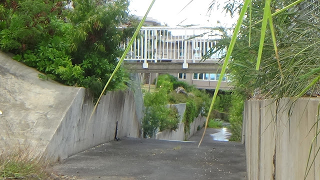 A resident, Pat, tells me that the boulders washed over the pillars and landed in this concrete basin. Though they didn't go further — the residential area is just several feet away — there had been great amounts of sediment in the upper basin covering concrete. Trees and other foliage had flourished there, and were unearthed by the floodwater. That caused blockage at the channel, and the flood damaged more than 20 homes.